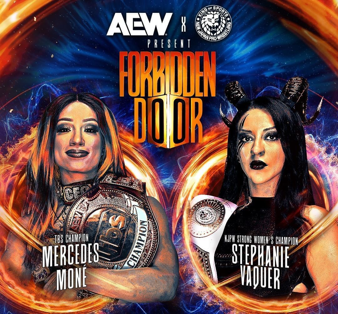 After successfully shielding her AEW TBS Title on the May 29 episode of Dynamite, Mercedes Moné was stood up to by Stephanie Vaquer, the NJPW Strong Women's Champion. They went head to head, holding up their titles. The following week, it was declared that they would contend in a Winner Takes All match at Forbidden Door for the two titles. However, Moné needed to protect her title against Zeuxis, Vaquer's tag team partner, on the June 12 episode of Dynamite. If Moné lost, the Forbidden Door match would just be for Vaquer's title, which Mone won.