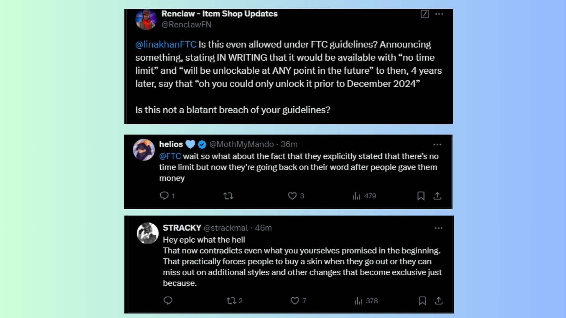 While most players were outraged, some were concerned about the legality of the move. This question comes amidst Epic Games having to shell out $245 million after an FTC lawsuit. Some users even went as far as mentioning FTC-related accounts on the post: